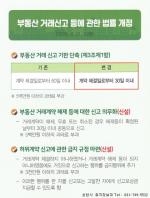[통합뉴스 안광성 기자] 부동산 실거래 신고기한 단축 등 ‘부동산 거래신고 등에 관한 법률’ 일부 개정안이 오는 21일부터 시행된다.개정에 따라 부동산 매매계약 체결한 경우 부동산 거래신고 기한이 기존 60일에서 30일로 단축됐고, 부동산 거래신고 후 거래계약이 해제, 무효 또는 취소된 경우에도 해제 등이 확정된 날부터 30일 이내에 반드시 신고해야 한다.