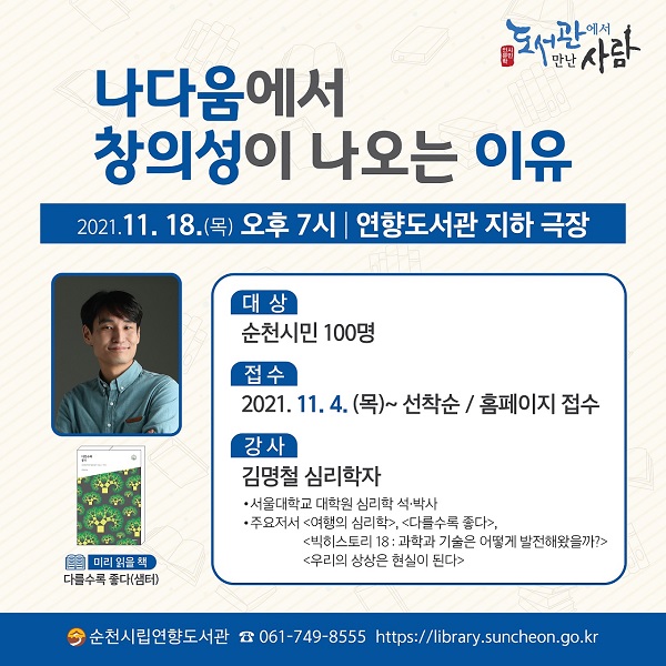 [통합뉴스 오중일 기자] 순천시(시장 허석)는 18일 저녁 7시 연향도서관 극장 ‘연’에서 김명철 심리학자를 초청하여 11월 시민인문학 강의를 개최한다.
