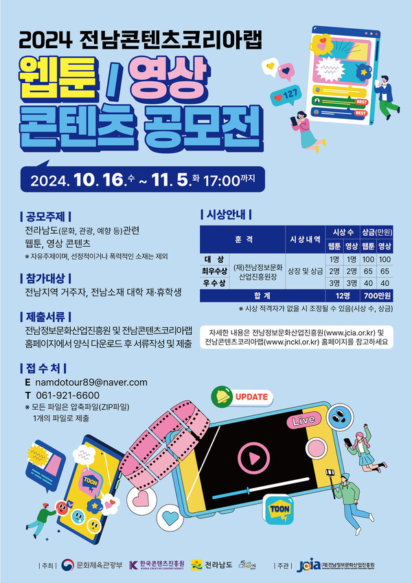 접수는 오는 11월 5일까지로, 진흥원 또는 전남콘텐츠코리아랩 누리집에서 제출 서류 양식을 내려받아 웹툰 작품 또는 영상물과 함께 전자우편(namdotour89@naver.com)으로 접수하면 된다.