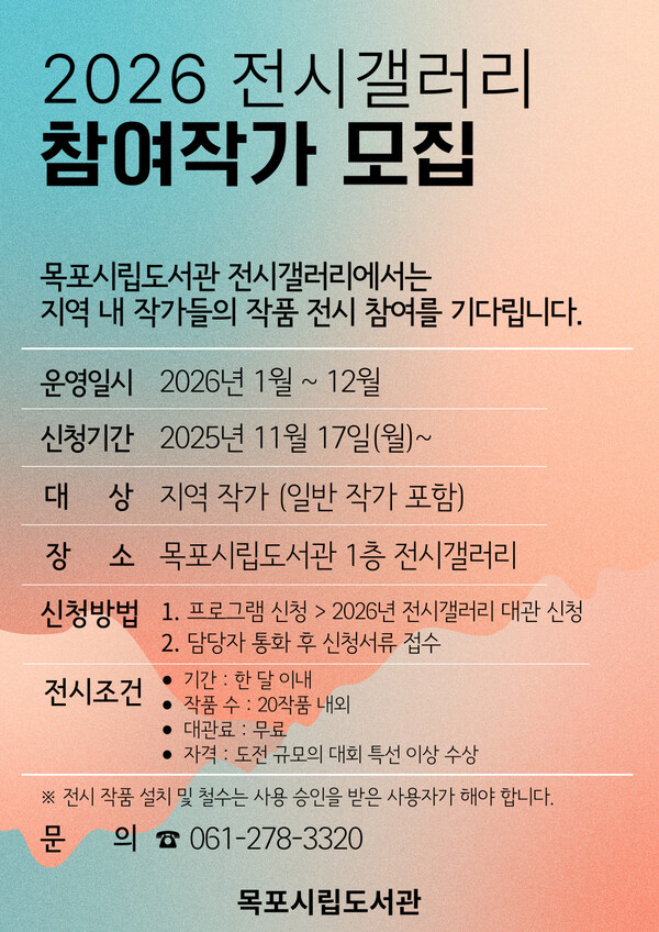 [통합뉴스 김영근 기자] 목포시립도서관이 2026년도 전시갤러리 운영을 위해 참여 작가를 모집한다.