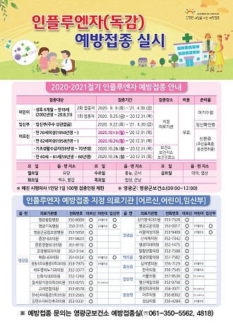 [통합뉴스 신동진 기자] 영광군(군수 김준성)은 2020-2021절기 인플루엔자의 유행과 코로나 19 동시 유행에 대비해 무료 예방접종을 실시한다.